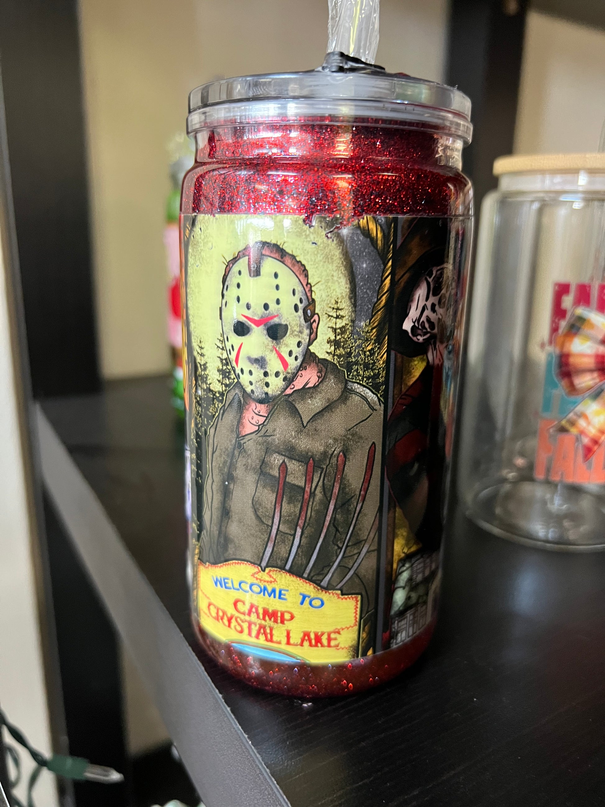 Halloween snow globe tumbler with decorated lid
